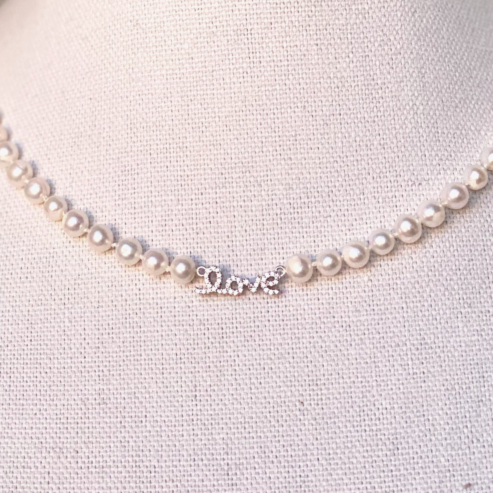 Beautiful cultured pearl necklace accented with a cubic zirconium Love charm with sterling silver closures.